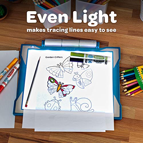 CRAYOLA LIGHT UP TRACING PAD: Features 1 Graphite Pencil, 12 Short Colored Pencils, 10 Tracing Sheets, and 10 Blank Sheets. (3 AA Batteries Required. Sold Separately)