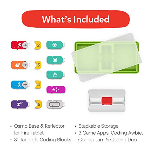 WHAT’S IN THE BOX: Osmo Base & Reflector for Fire Tablet, 31 tangible coding blocks including: Walk, Jump, Hand, Magic, Rest, Quantifiers (Numbers), Repeat, Subroutines, Stackable storage for game pieces, 3 Game Apps: Coding Awbie, Coding Jam & Coding Duo.