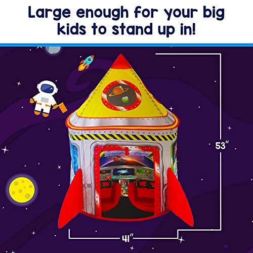 BIGGER THAN YOUR AVERAGE PLAY TENT, our 53” H x 41” W space rocket tepee tent for kids comfortably accommodates three children, and is big enough for even your biggest astronauts to stand up in. Make into a cosy reading tent for kids, use as a kids outdoor playhouse, as great tents for parties or add to your existing astronaut toys and space toys for 3, 4, 5, 6, 7 or 8 year old boys or girls.