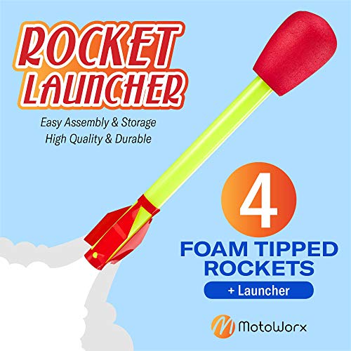 🌞 HOURS OF OUTDOOR EXCITEMENT – This awesome kids toy provides harmless dynamic entertainment that lets kids burn up all that extra energy while having the time of their lives! The set includes four foam tipped rockets plus a folding red colored stand.